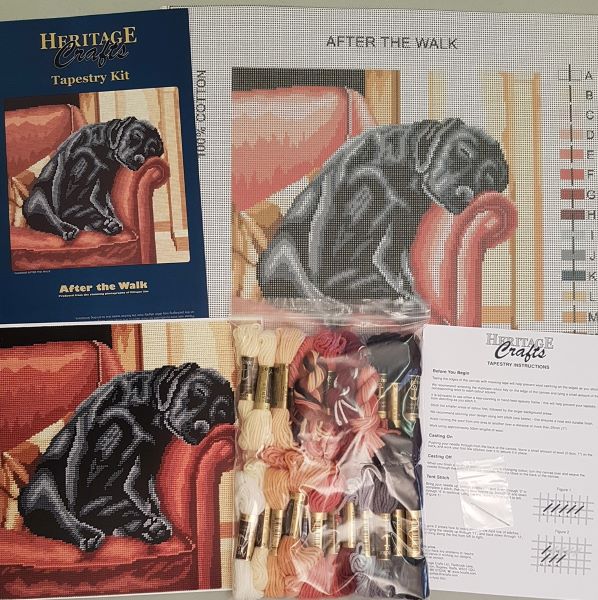 After the Walk Tapestry Kit from Heritage Crafts is contemporary dog tapestry design, adapted from the Villager Jim photography, that will fit into both a modern and traditional setting, stitched on full colour printed premium 100% cotton 10 holes per inch canvas.