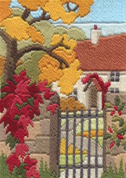 Autumn Garden long stitch kit is perfect for finishing as a picture. One in a set of four seasonal country landscape kits, stitched in long vertical stitches, in seasonal Anchor Tapestry Wool colour tones.