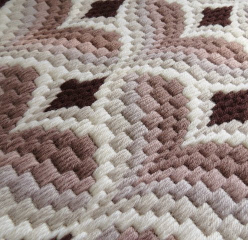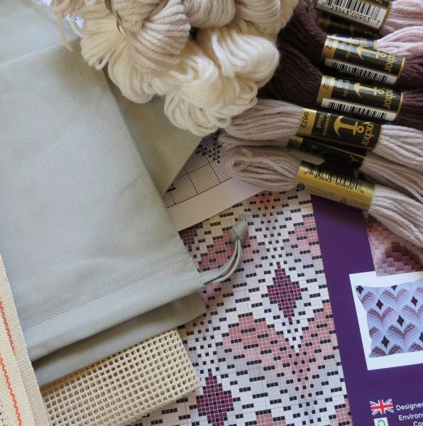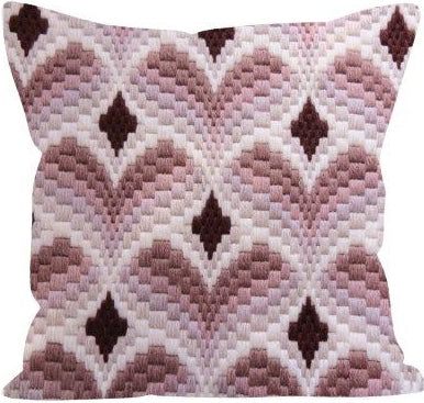 Easy to work, this Bargello Kit is stitched on 7 holes per inch plain canvas using 3 strands of tapestry wool for excellent coverage. This large project is perfect for cushion front Bargello canvas work, in dusky lilacs that graduate and repeat throughout the design.
