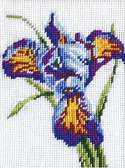 Blue Iris needlepoint tapestry kit is stitched on 10 holes per inch duo canvas, in stranded cotton threads throughout, stitched in traditional tent stitch or half cross stitch. A lovely small project, perfect for new stitchers and those with wool allergies.