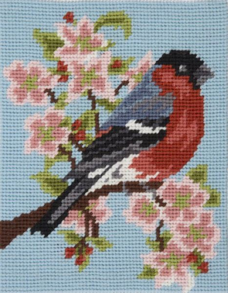 Bullfinch Tapestry Needlepoint Kit is suitable for both new and experienced stitchers, with a pretty garden bird on pink blossoming branches flowers.