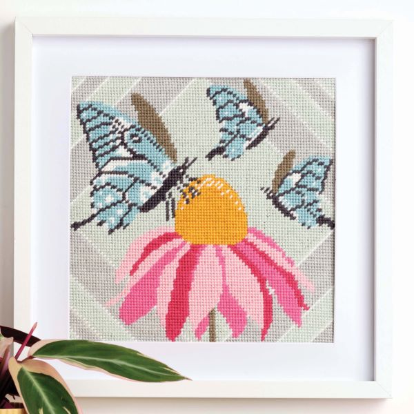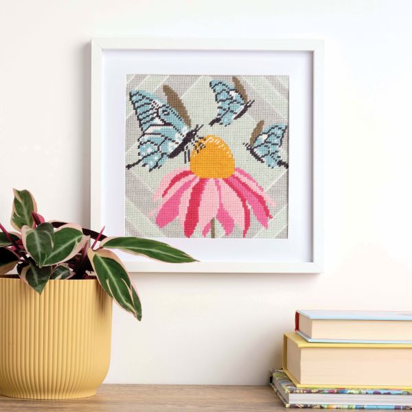 Butterfly Garden tapestry kit is stitched with soft cotton threads on full colour printed 12 holes per inch canvas, designed to co-ordinate with In the Garden tapestry kits in the Anchor Tapestry collection designed by Thread & Mercury.