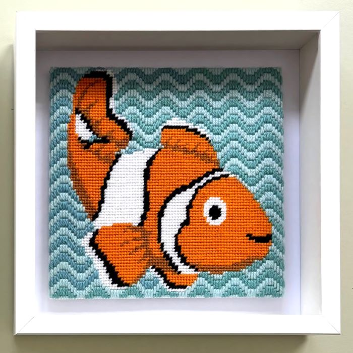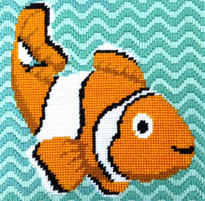 Finnegan Clown Fish Tapestry Needlepoint Kit is suitable for both new and experienced stitchers, with very beginner friendly instructions. A lovely deep sea tapestry kit with a colourful orange clown fish on a long stitch, bargello style watery teal background.