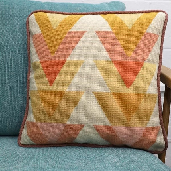 Coral Triangles Tapestry Needlepoint Kit is a modern geometric tapestry kit, stitched in cheerful sunshine colours.