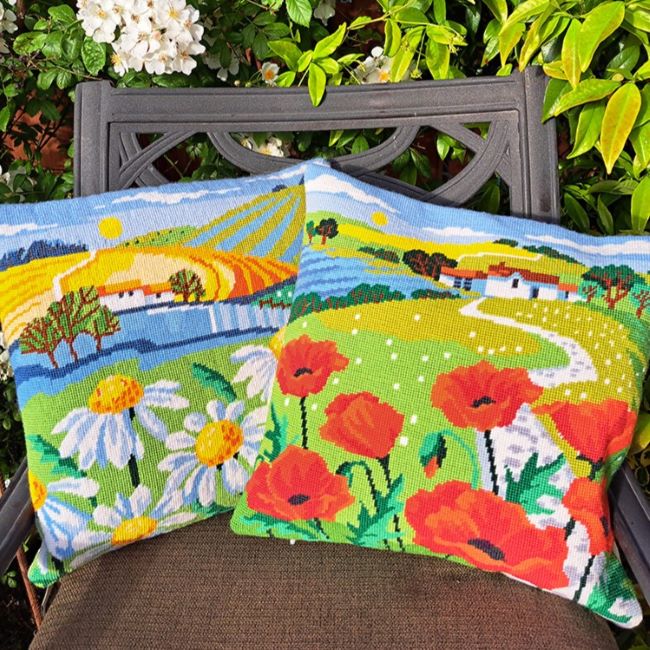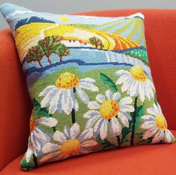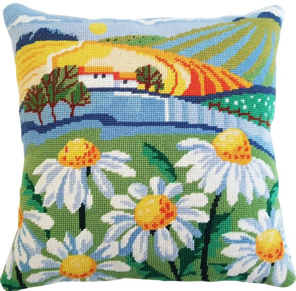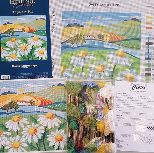 Daisy Landscape Tapestry Kit from Heritage Crafts is contemporary countryside landscape tapestry design, adapted from the artwork of UK artist Karen Carter, that will fit into both a modern and traditional setting, stitched on full colour printed premium 100% cotton 10 holes per inch canvas.