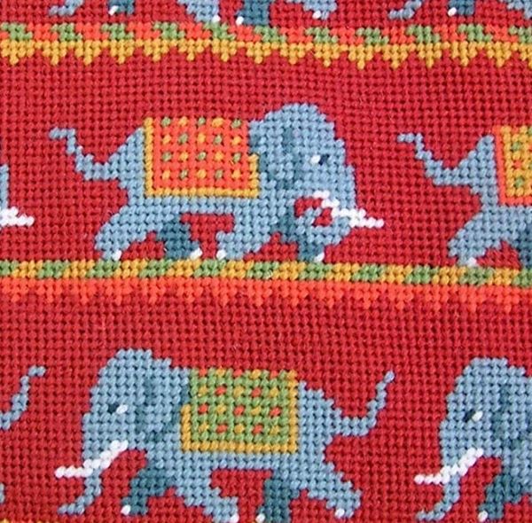 The Fei Collection Elephant Parade Tapestry Needlepoint Kit is a unique and colourful ethnic style tapestry kit design with rows of elephant on a vibrant red background.