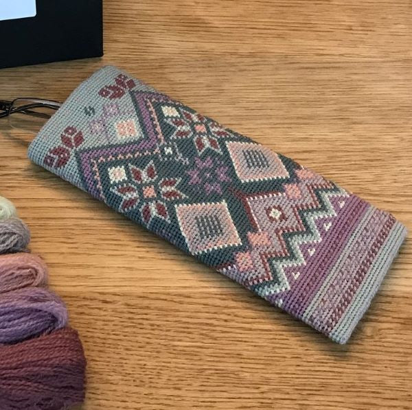 Appletons Fair Isle tapestry kit is printed on a square canvas and folded to make a tapestry case for glasses, sun glasses, mobile phone ... a protective sleeve stitched in half cross stitch or tent stitch in Appleton Crewel wools.