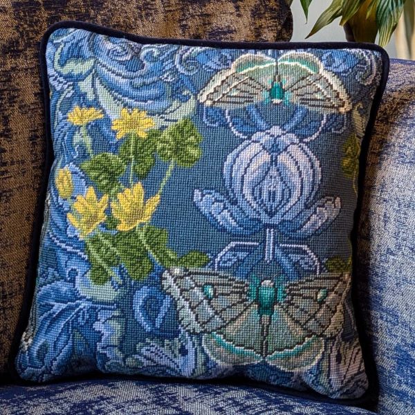 Bothy Threads Fatal Anemone Tapestry Needlepoint Kit is a botanical wildlife tapestry design of beautiful Arts and Crafts stylized Butterflies based on the original artwork by UK artist April Mawhinney for the Bloomsbury Moth Fabric, an eclectic design inspired by William Morris