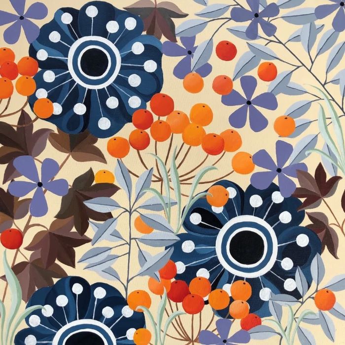 Flowers and Berries Tapestry Kit from Heritage Crafts is contemporary floral tapestry design, adapted from the unique artwork of UK artist Faye Baines, that will fit into both a modern and traditional setting, stitched on full colour printed premium 100% cotton 10 holes per inch canvas.