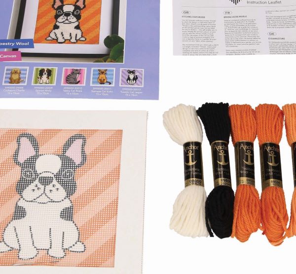 Anchor French Bulldog tapestry kit is stitched on full colour printed 12 holes per inch canvas. Suitable finished as a tapestry picture, each kit includes Anchor Tapestry wool to stitch in traditional tent stitch or half cross stitch, so perfect for stitchers of all abilities.