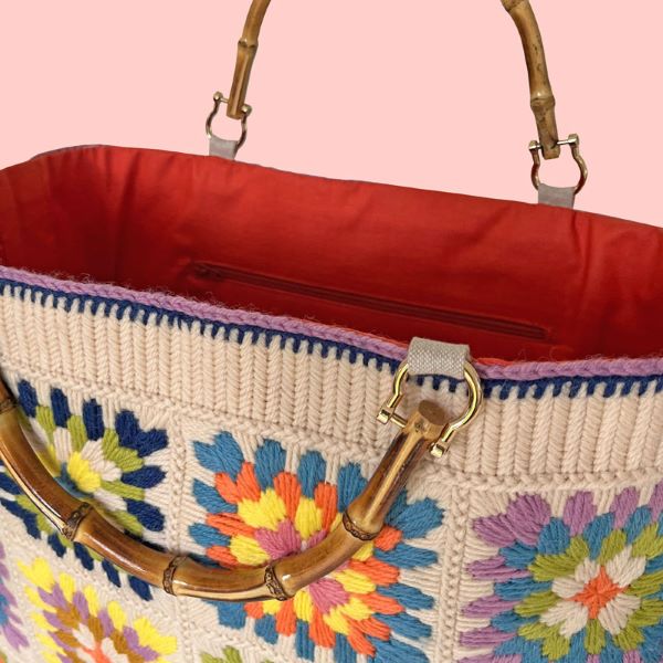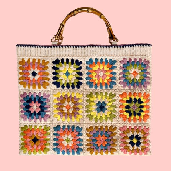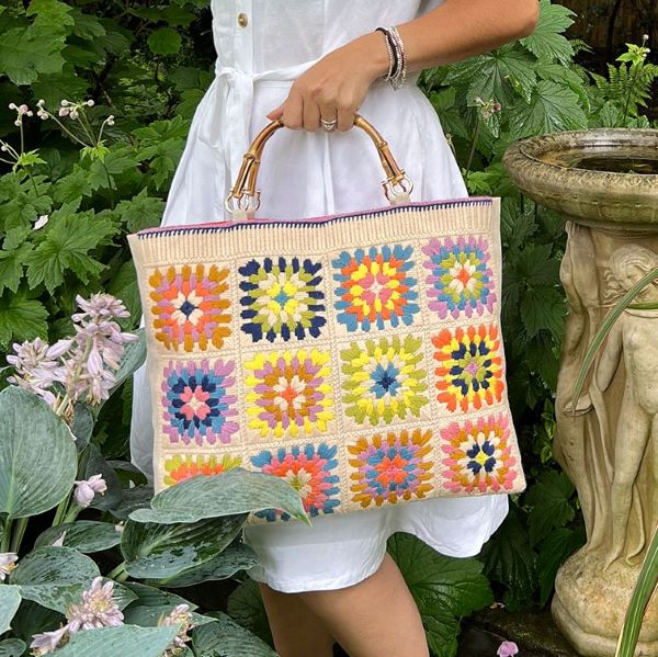 Glorafilia Granny Squares Bag tapestry needlepoint kit is a stunning tapestry bag inspired by the art of crocheting, with attractive bamboo handles, stitched in pure new Anchor Tapestry Wools.