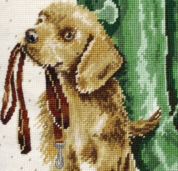 Bothy Threads Hopeful Tapestry Needlepoint Kit is a modern dog tapestry design, with a gorgeous hopeful puppy waiting for a walk.