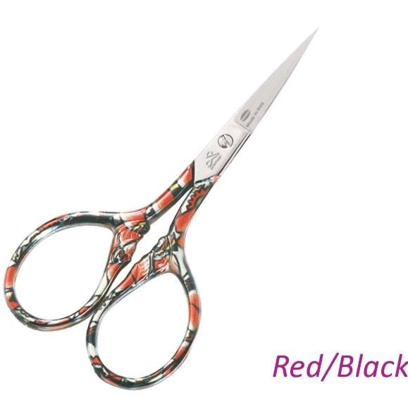 Lion Tail Red/Black Embroidery Scissors that are perfect for tapestry wool, with an elegant etched mottled red/black handles and nickel finish.