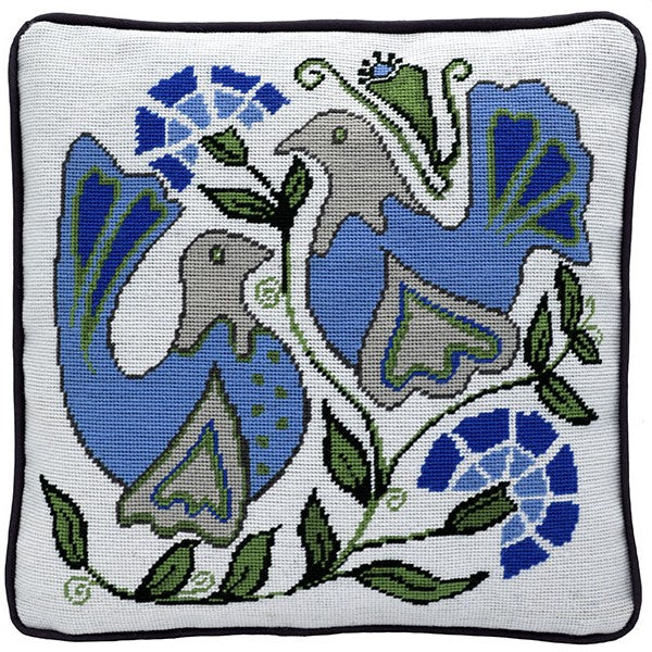 Cleopatra's Needle Lovebirds Tapestry Kit, a pair of lovebirds in a wonderful naïve art style by UK artist Katrin Eagle, is full colour printed on 12 holes per inch canvas, stitched in tent stitch using finest quality Appleton Tapestry wools.