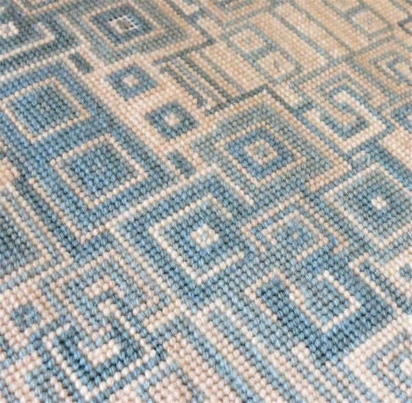 Designer's Needle Mandala Squares Tapestry Kit is a lovely geometric tapestry kit inspired the essence of the Mandala circle, worked in tent stitch on 10 hole full colour printed premium tapestry canvas. A delight to stitch in lovely shades of duck egg blue, pale fawn and ivory cream.
