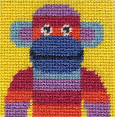Mini Monkey Starter Tapestry Needlepoint Kit is suitable for children and new stitchers, a lovely colourful sock-monkey puppet in bright colours and easy defined areas of stitching.