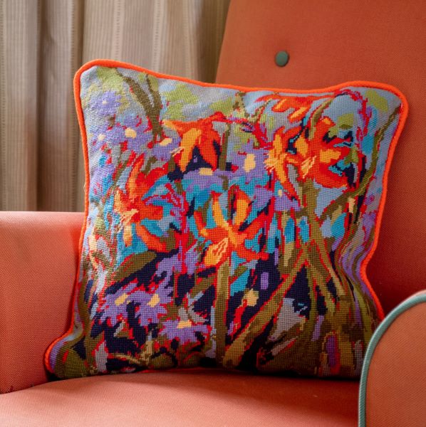 Celia Lewis Montbretia Tapestry Kit is a beautiful heirloom quality floral art tapestry kit, with rich and vibrant colour and outstanding detail, that would fit perfectly into a modern or traditional interior setting as a large cushion.