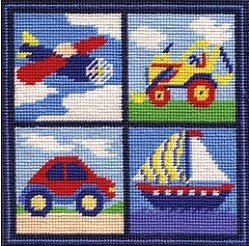 Nursery Panel Boy Tapestry Kit is suitable for children and new adult stitchers. A beginners nursery/sampler style tapestry kit with transport vehicles on printed canvas, this starter kit uses premium tapestry wool; a great way to learn to stitch.