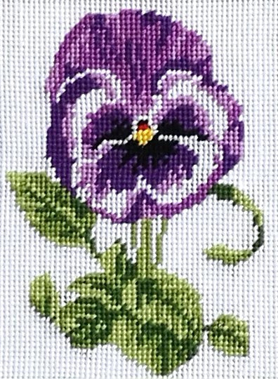 Pansy needlepoint tapestry kit is stitched on 10 holes per inch duo canvas, in stranded cotton threads throughout, stitched in traditional tent stitch or half cross stitch. A lovely small project, perfect for new stitchers and those with wool allergies.