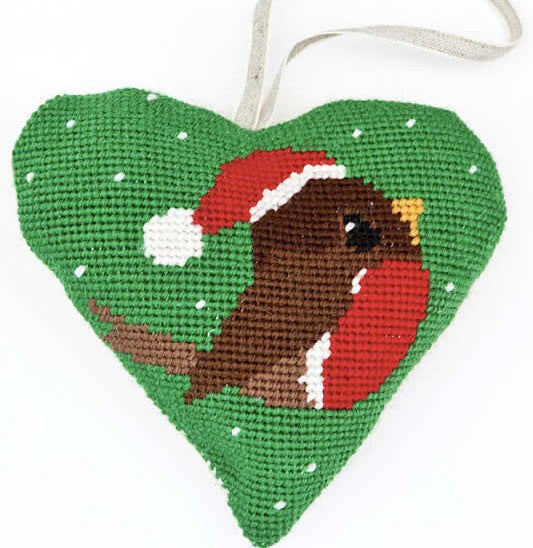 Cleopatra's Needle Robin Heart Tapestry Needlepoint Kit is suitable for both new and experienced stitchers, a lovely seasonal Christmas heart hanging decoration tapestry kit.