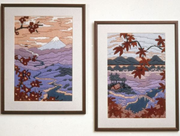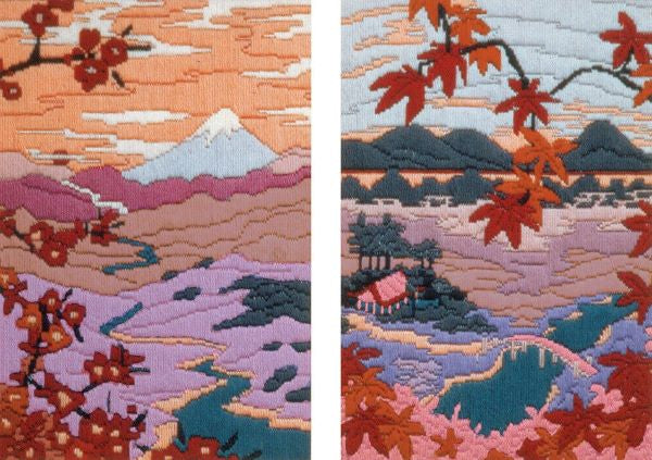 Serenity and Tranquillity Long Stitch kits are two beautiful Oriental landscape long stitch kits with countryside views to Mount Fuji, across countryside, rivers, and mountains.