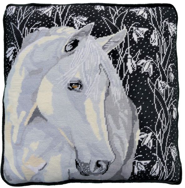 Snowdrop Tapestry Kit is a beautiful heirloom quality equestrian horse tapestry kit, with a striking limited colour palette and outstanding detail, that would fit perfectly into a modern or traditional interior setting as a large cushion.