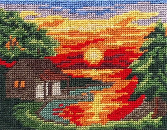 Sunset Cabin needlepoint tapestry kit is stitched on 10 holes per inch duo canvas, in stranded cotton threads throughout, stitched in traditional tent stitch or half cross stitch. A lovely small project, perfect for new stitchers and those with wool allergies.