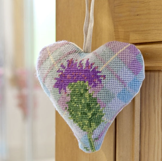 Cleopatra's Needle Thistle Heart Tapestry Needlepoint Kit is suitable for both new and experienced stitchers, a lovely floral heart hanging decoration tapestry kit with tartan background.