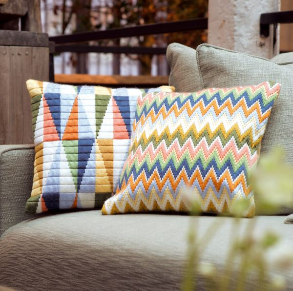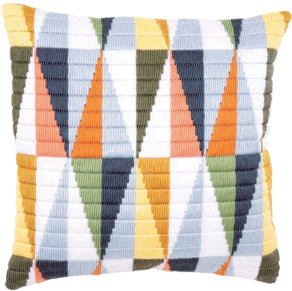 Vervaco Triangles Long Stitch Kit is a colourful geometric cushion front long stitch kit using chunky Acrylic Thread.