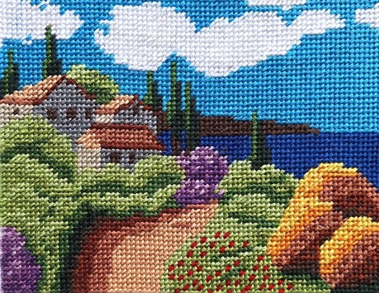 Tuscan Hills needlepoint tapestry kit is stitched on 10 holes per inch duo canvas, in stranded cotton threads throughout, stitched in traditional tent stitch or half cross stitch. A lovely small project, perfect for new stitchers and those with wool allergies.