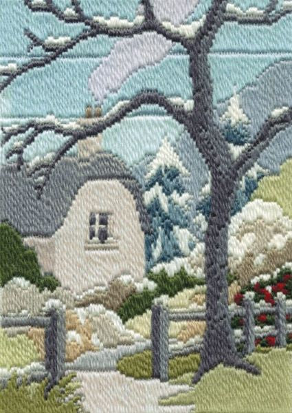 Derwentwater Designs Winter Garden Long Stitch kit is a beautiful winter landscape long stitch kit design with a pretty thatched cottage in seasonal snowy country gardens.