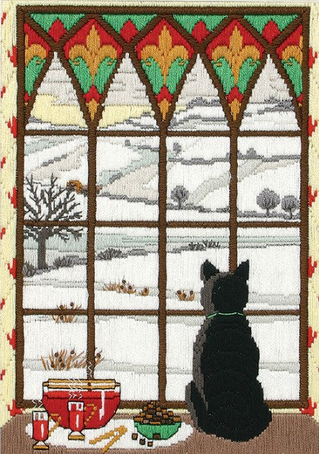 Anchor Winter Through the Window Long Stitch Kit is a seasonal outline printed long stitch kit design with a black cat looking across a snowy Winter landscape, part of a collection of quality silken long stitch kits.
